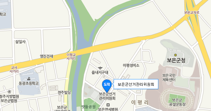 - 동다리교를 지나 첫번째 교차로에서 직진, 약 50m 전방 좌측 보은군선거관리위원회
