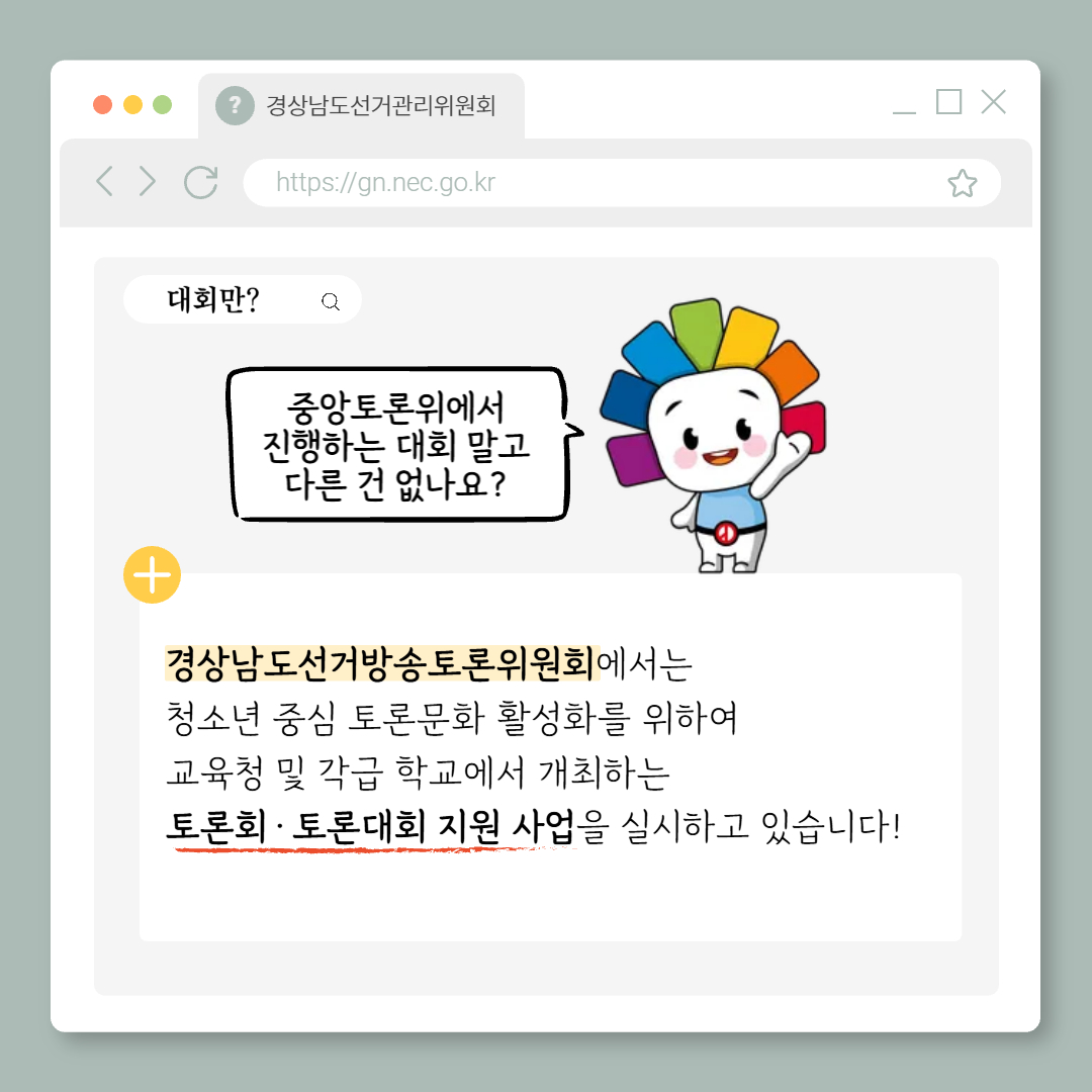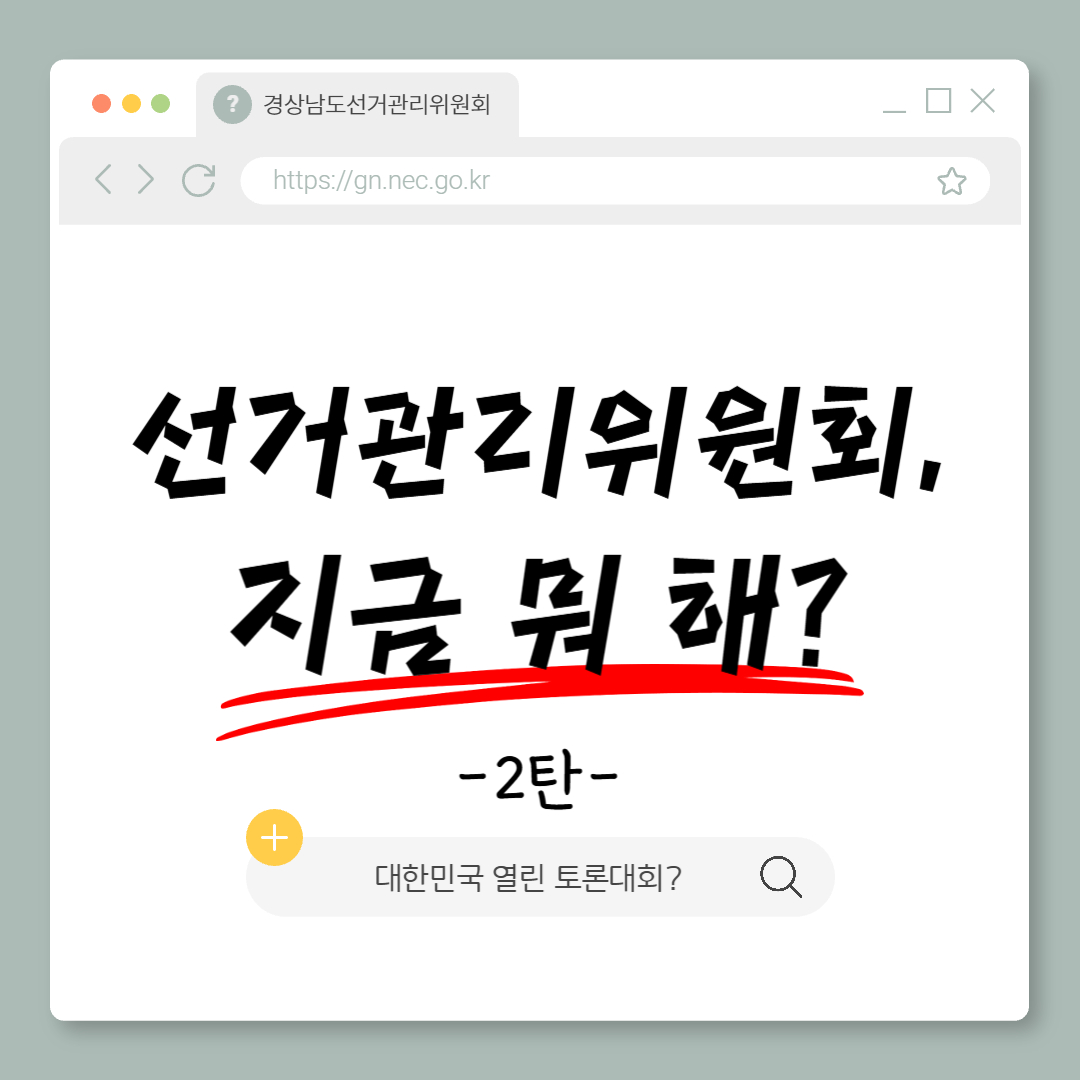경상남도선거관리위원회(055-212-0760)에서 제작한 [카드뉴스] 선거관리위원회, 지금 뭐 해? (2화: 대한민국 열린 토론대회?) 저작물은 "공공누리" 출처표시-상업적 이용금지-변경금지 조건에 따라 이용할 수 있습니다. 자세한 내용은 [저작권정책]을 확인하십시오.