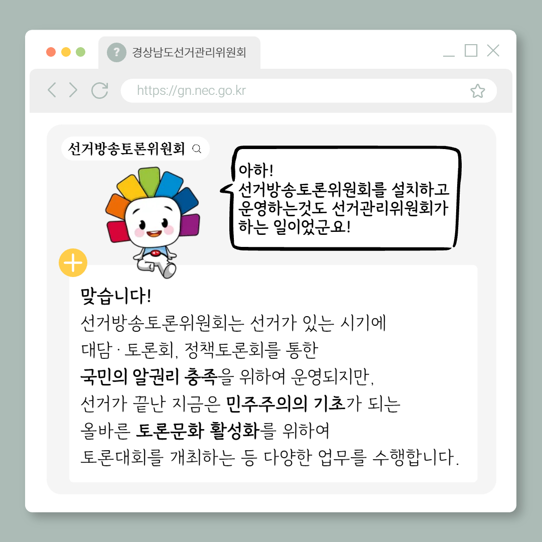 Q.아하! 선거방송토론위원회를 설치하고 운영하는것도 선거관리위원회가 하는 일이었군요!