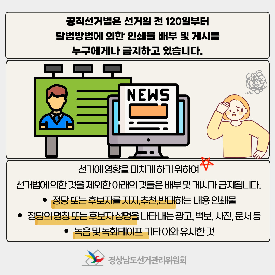 공직선거법은 선거일 전 120일부터 탈법방법에 의한 인쇄물 배부 및 게시를 누구에게나 금지하고 있습니다.