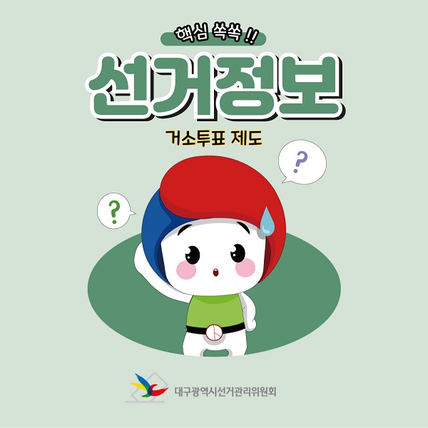대구광역시선거관리위원회 홍보과(053-767-2584)에서 제작한 핵심쏙쏙!! 선거정보(거소투표 제도) 저작물은 "공공누리" 출처표시-상업적 이용금지-변경금지 조건에 따라 이용할 수 있습니다. 자세한 내용은 [저작권정책]을 확인하십시오.