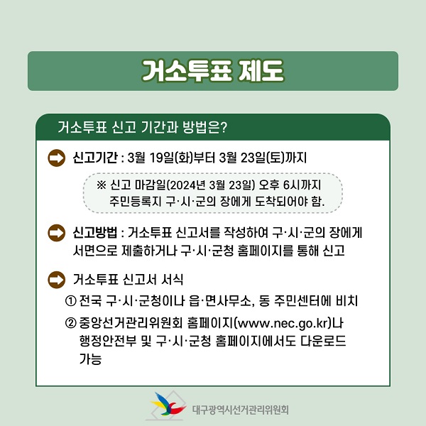 - 신고방법 : 거소투표 신고서를 작성하여 구·시·군의 장에게 서면으로 제출하거나 구?시?군청