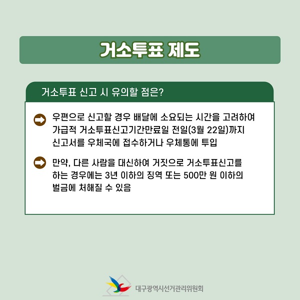 - 만약, 다른 사람을 대신하여 거짓으로 거소투표신고를 하는 경우에는 3년 이하의 징역 또는