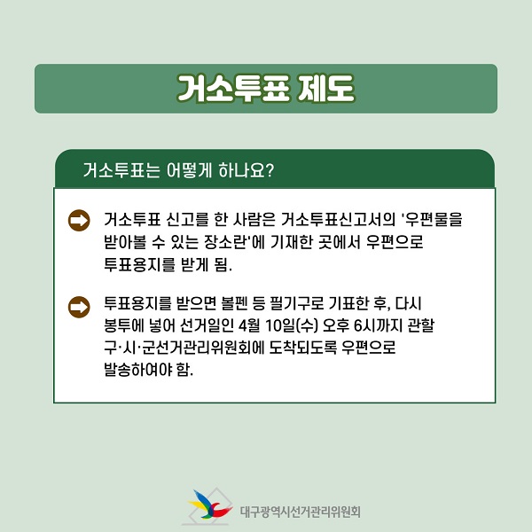 - 투표용지를 받으면 볼펜 등 필기구로 기표한 후, 다시 봉투에 넣어 선거일인 4월 10일(수)