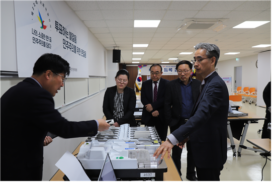 세종특별자치시선거관리위원회위원장(김용찬/사진 오른쪽)은 3월 21일 투표지분류기운용 실습과정을 직접 점검하고, 이번 국회의원선거의 개표가 정확하고 투명하게 이뤄질 수 있도록 만전을 기할 것을 당부했다. |