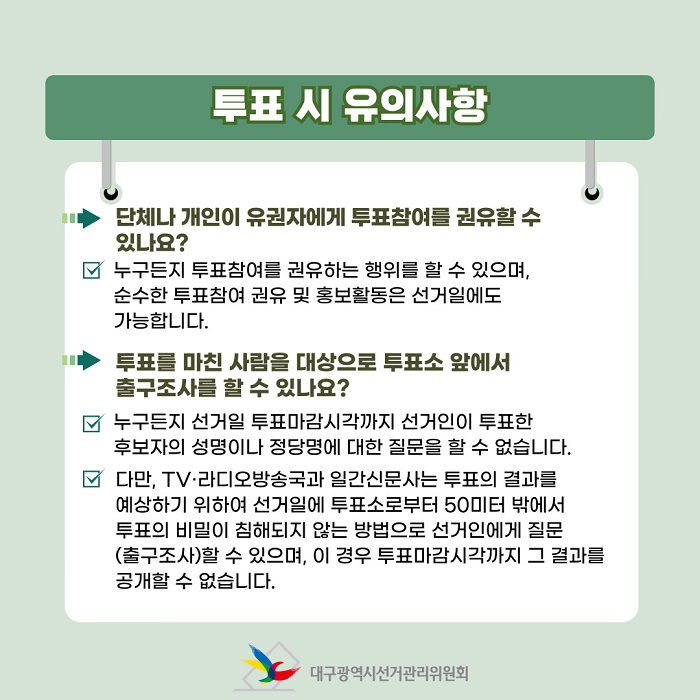 - 누구든지 투표참여를 권유하는 행위를 할 수 있으며, 순수한 투표참여 권유 및 홍보활동은 선거일에도 가능합니다.