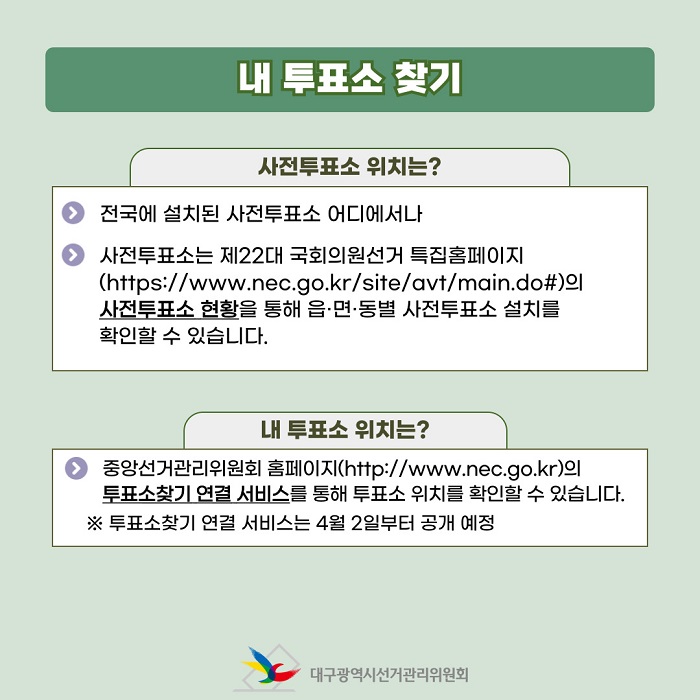 - 사전투표소는 제22대 국회의원선거 특집홈페이지(https://www.nec.go.kr/site/avt/main.do#)의 사전투표소 현황을 통해 읍·면·동별 사전투표소 설치를 확인할 수 있습니다.