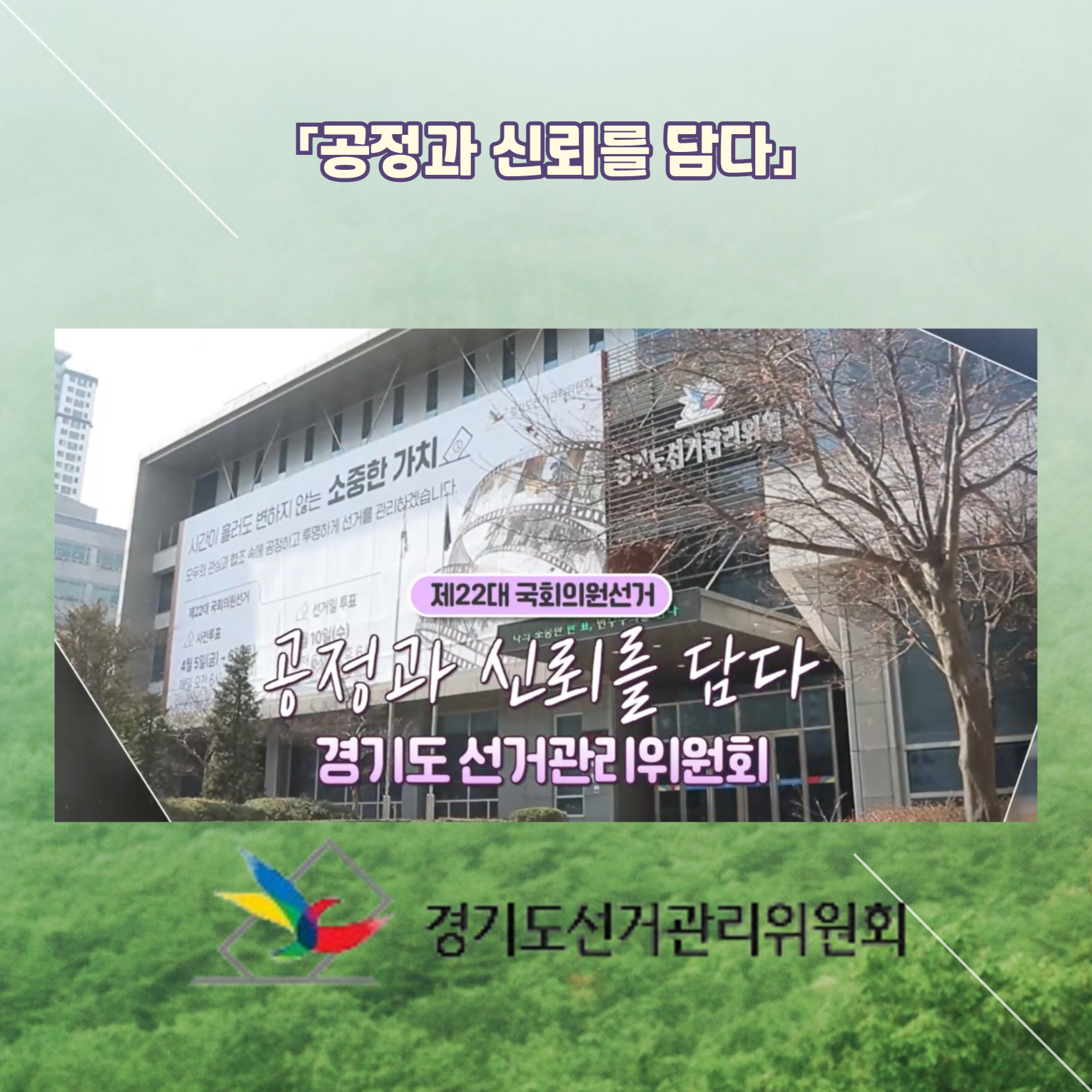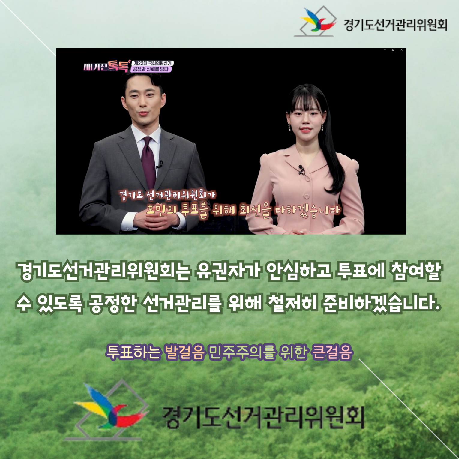 경기도선거관리위원회(--)에서 제작한 제22대 국회의원선거 OBS TV 공동기획 「공정과 신뢰를 담다-투표편」 제작·방영 저작물은 "공공누리" 출처표시-변경금지 조건에 따라 이용할 수 있습니다. 자세한 내용은 [저작권정책]을 확인하십시오.