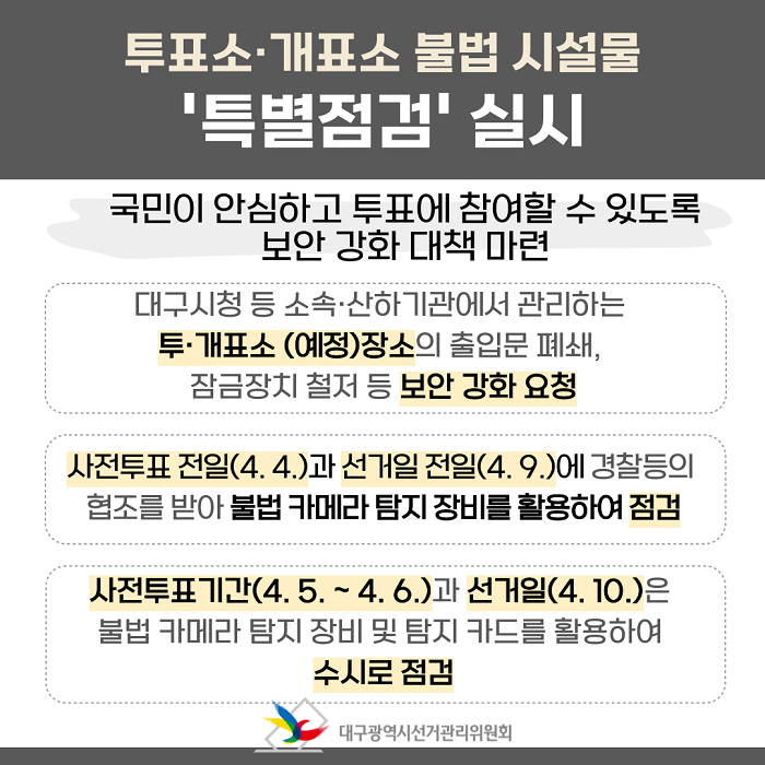 - 사전투표기간(4. 5. ~ 4. 6.)과 선거일(4. 10.)은 불법 카메라 탐지 장비 및 탐지 카드를 활용하여 수시로 점검