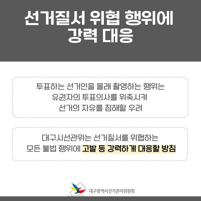 - 대구시선관위는 선거질서를 위협하는 모든 불법 행위에 고발 등 강력하게 대응할 방침