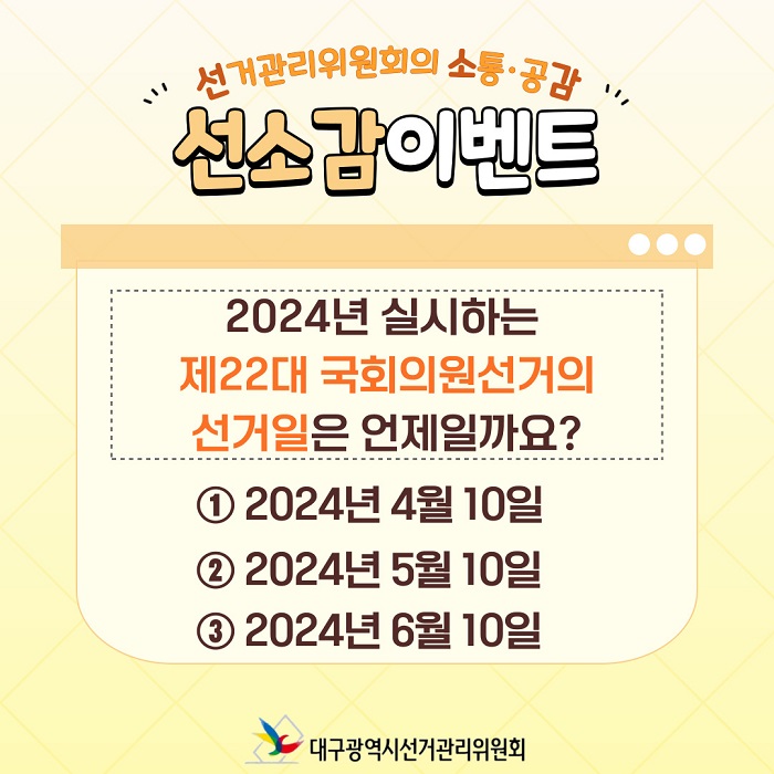 #대구선관위 #대구시선관위 #제22대국회의원선거 #퀴즈 #이벤트 #구독 #팔로우 #좋아요 #모바일상품권 #선거일 #4월10일 #투표 #참여 #소통 #공감