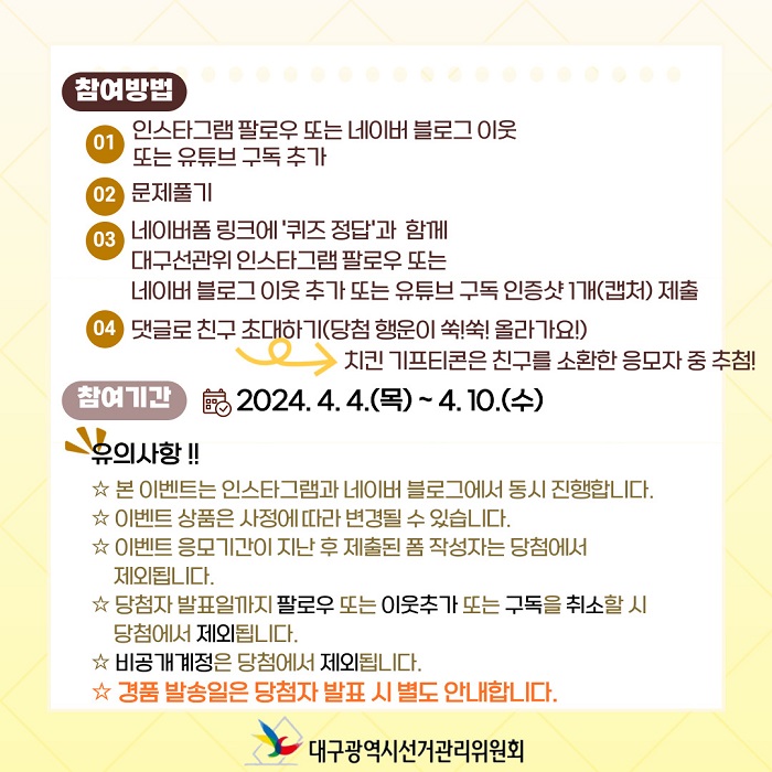 대구시선거관리위원회 온라인 공식 채널인 「인스타그램 팔로우, 네이버블로그 이웃추가 또는 유튜브 구독」을 하고 「선소감이벤트」 카드에서 제시하는 문제의 정답을 제출하면 추첨을 통해 “치킨 기프티콘(2만5천원)” 또는 “커피상품권(1만원)” 또는 “편의점상품권(5천원)”을 드립니다.