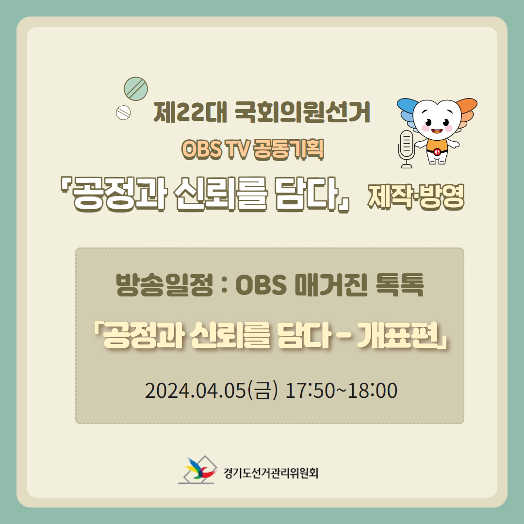 방송일정 : OBS 매거진 톡톡 「공정과 신뢰를 담다-개표편」 2024. 4. 5.(금) 17:50~18:00