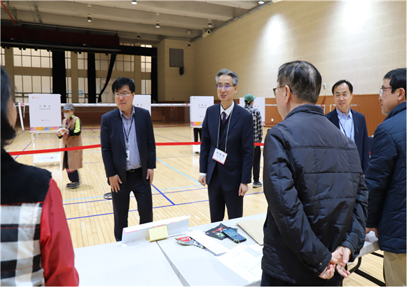 세종특별자치시선거관리위원회위원장(김용찬, 왼쪽에서 세번째)이 사전투표 첫날인 4월 5일 도담동사전투표소를 방문하여 사전투표 진행상황을 점검했다. 아울러 사전투표관리관 및 참관인 등에게 공정한 자세로 투표관리 및 참관에 임해줄 것과 선거인의 투표소 내의 안전에도 각별히 유의할 것을 당부했다. |