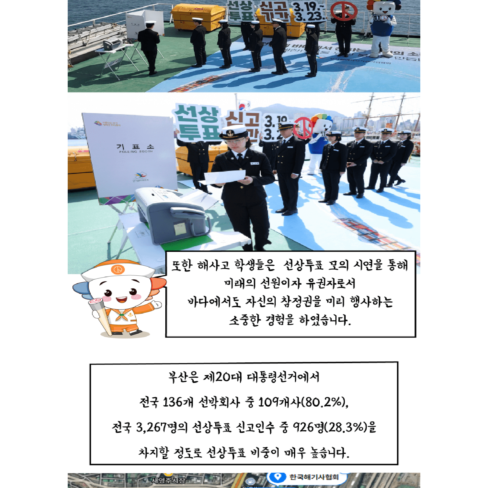 부산시위원회는 한국해양수산연수원과 협업하여 해양수산연수원이 보유 중인 5,255톤급 실습선 한반도호를 배경으로 선상투표 홍보 퍼포먼스를 실시했습니다.