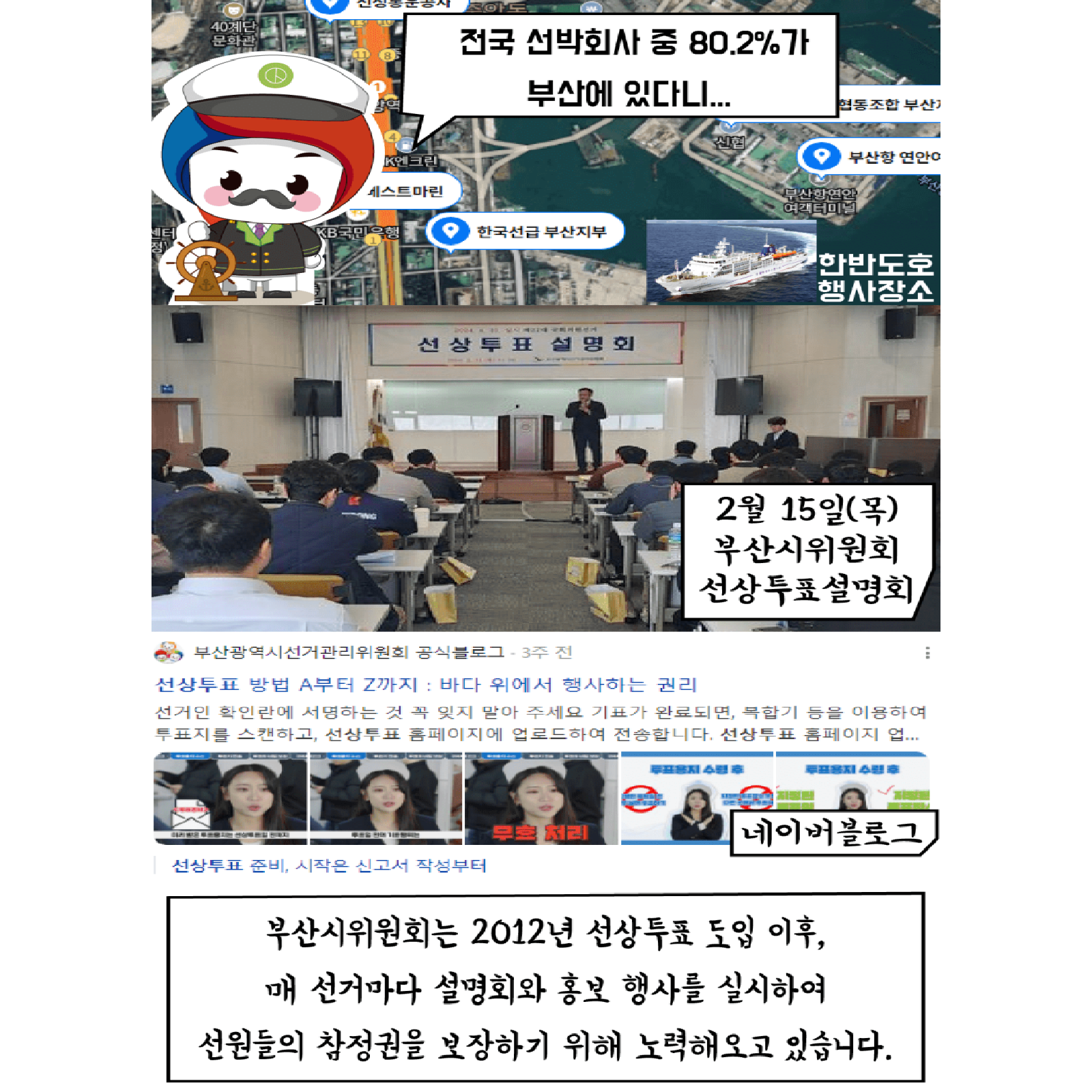 부산시위원회는 2021년 선상투표 도입 이후, 매 선거마다 설명회와 홍보 행사를 실시하여 선원들의 참정권을 보장하기 위해 노력해오고 있습니다.