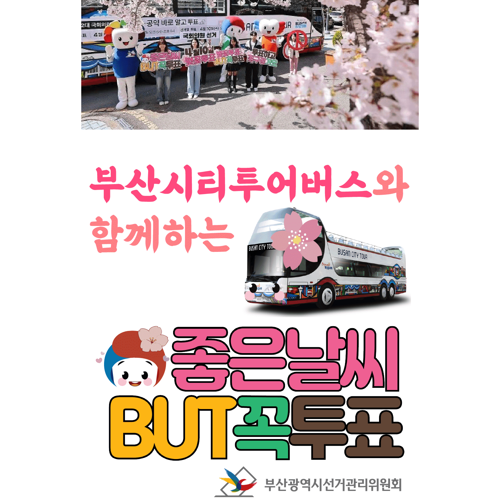 부산광역시선거관리위원회(051-851-7770)에서 제작한 부산시티투어버스와 함께하는 좋은날씨 BUT 꼭 투표 저작물은 "공공누리" 출처표시 조건에 따라 이용할 수 있습니다. 자세한 내용은 [저작권정책]을 확인하십시오.