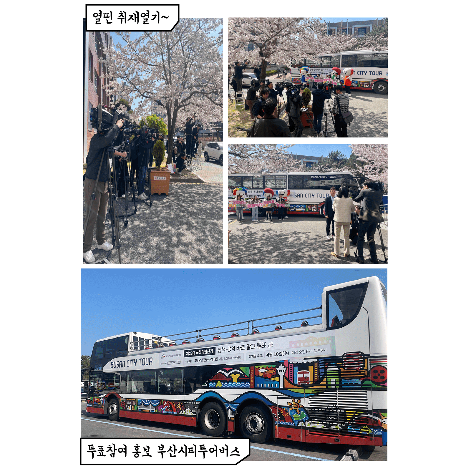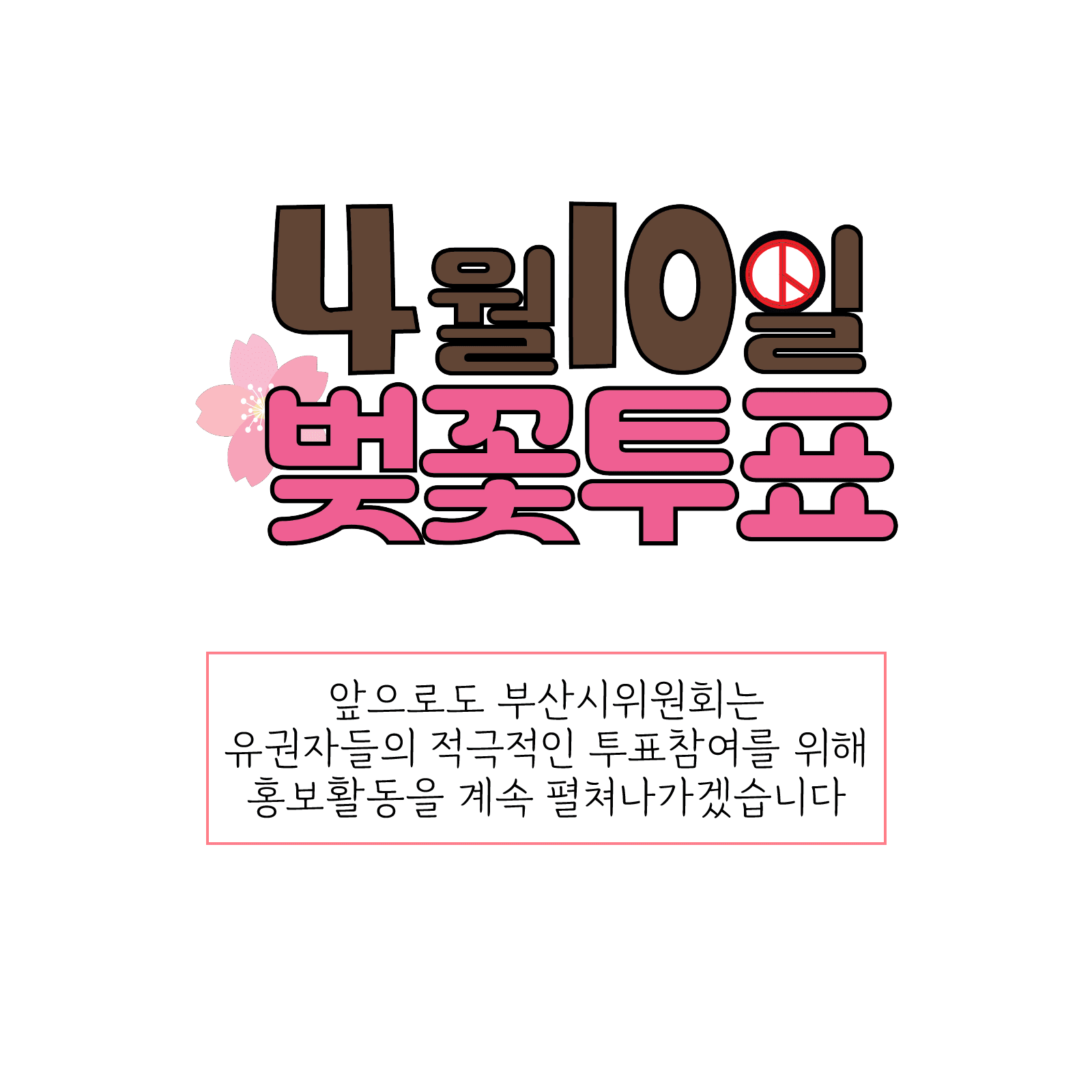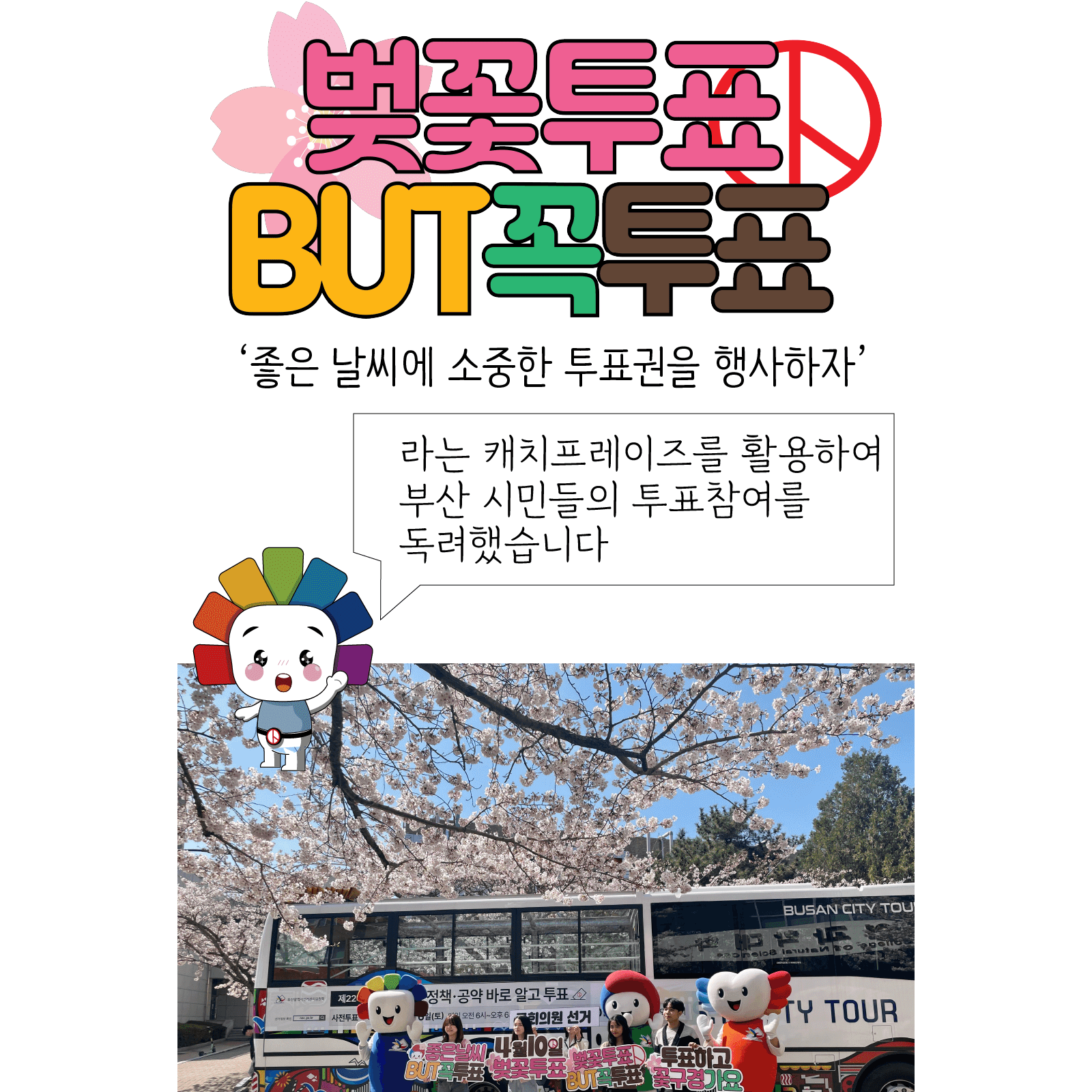 벚꽃이 만개한 부경대학교 캠퍼스 안 부산시위원회는 선거는 공휴일이라는 인식에서 벗어나 벚꽃투표 BUT 꼭 투표' '좋은 날씨에 소중한 투표권을 행사하자'라는 캐치프레이즈를 활용하여 부산 시민들의 투표참여를 독려했습니다.
