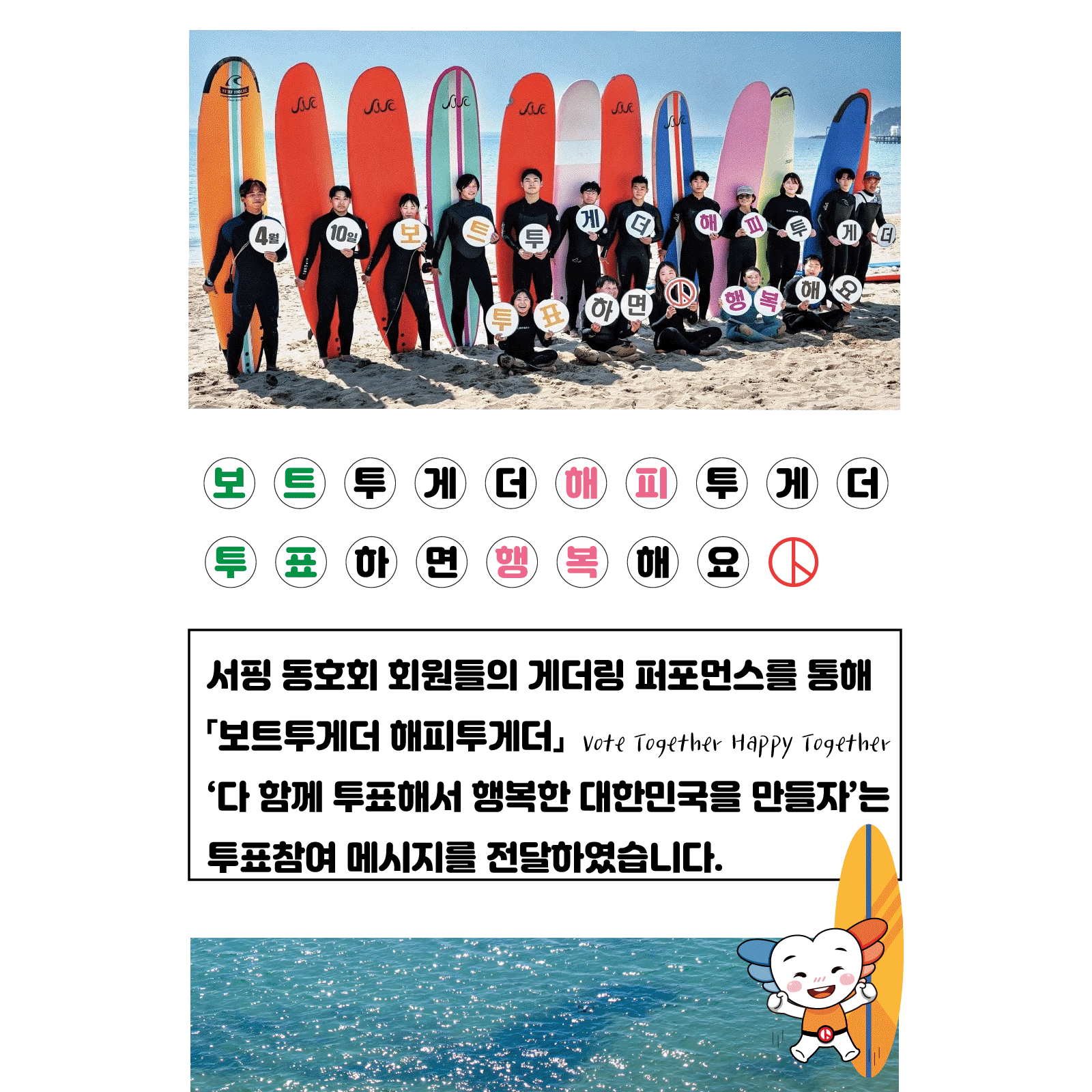 서핑 동호회 회원들의 게더링 퍼포먼스를 통해 "보트투게더 해피투게더" vote together happy together