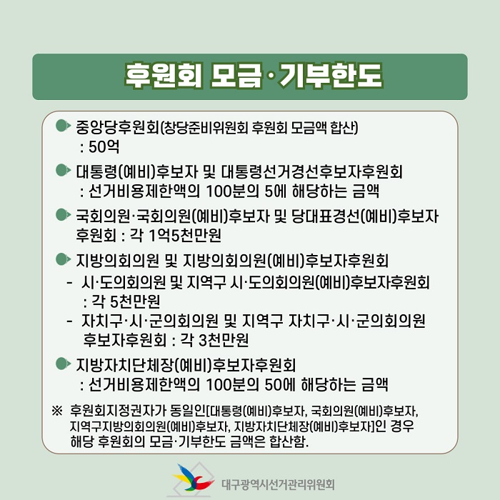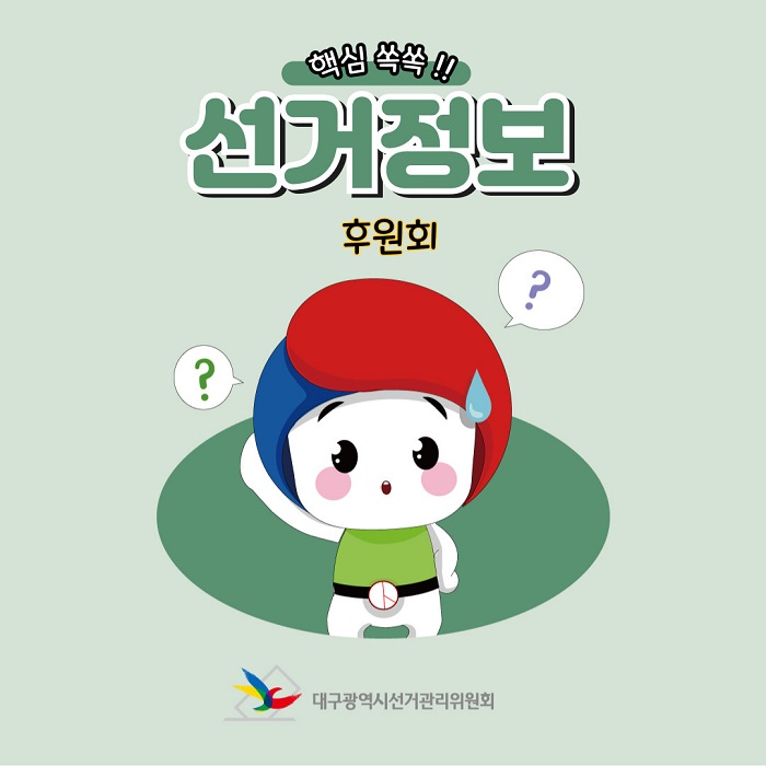 대구광역시선거관리위원회 홍보과(053-767-2584)에서 제작한 핵심쏙쏙!! 선거정보(후원회) 저작물은 "공공누리" 출처표시-상업적 이용금지-변경금지 조건에 따라 이용할 수 있습니다. 자세한 내용은 [저작권정책]을 확인하십시오.