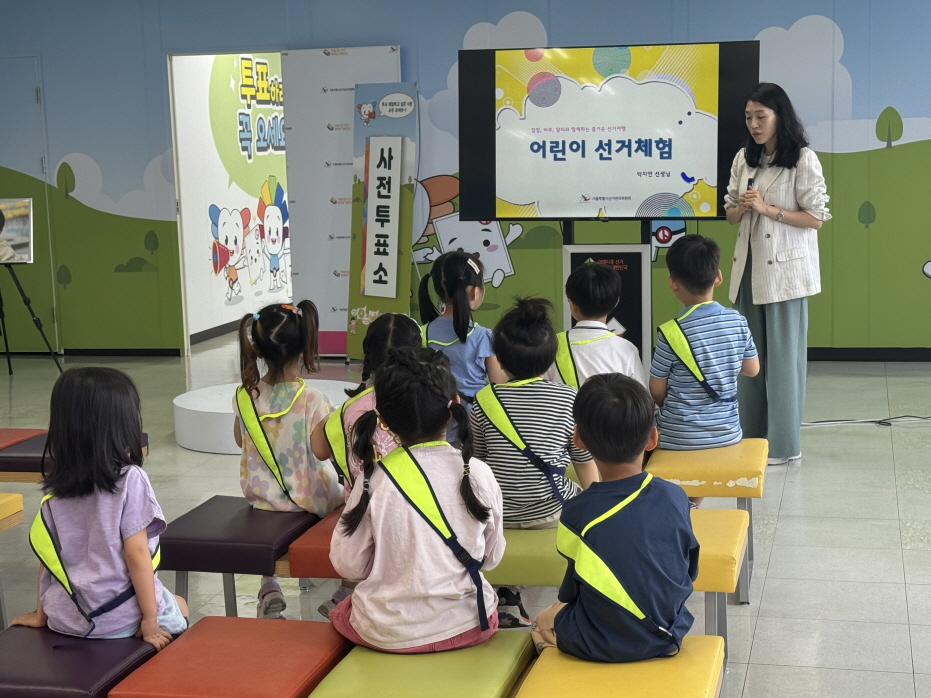 * 사진설명 : 9명의 원아들이 서울특별시선거관리위원회 선거체험관 강의존에서 민주시민교육 강사의 강의를 경청하고 있다.