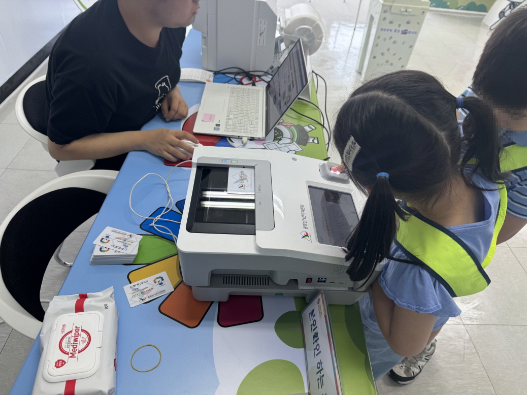 * 사진설명 : 선거체험관 체험존에서 한 원아가 본인확인기에 손도장을 찍고 있다.