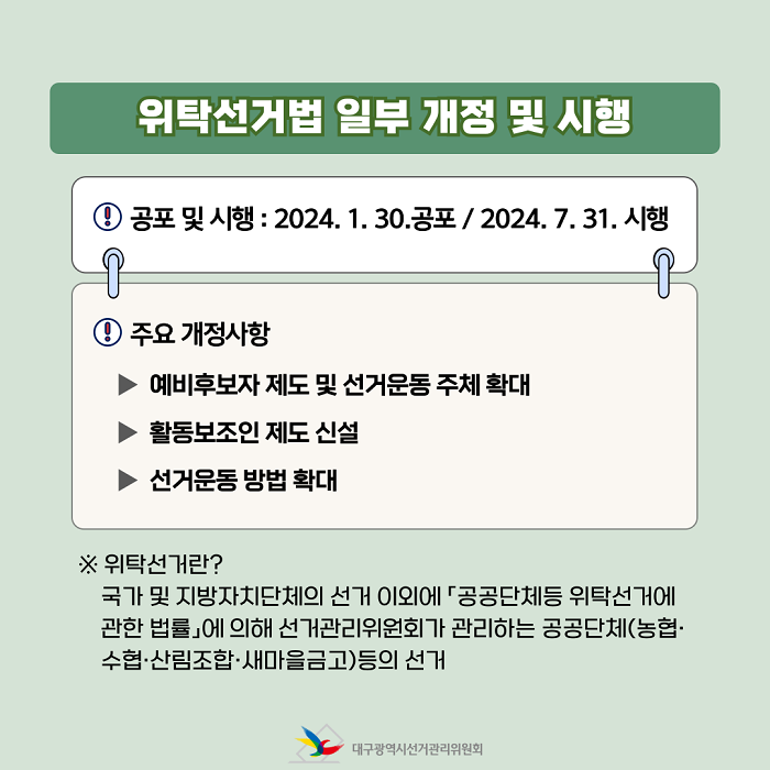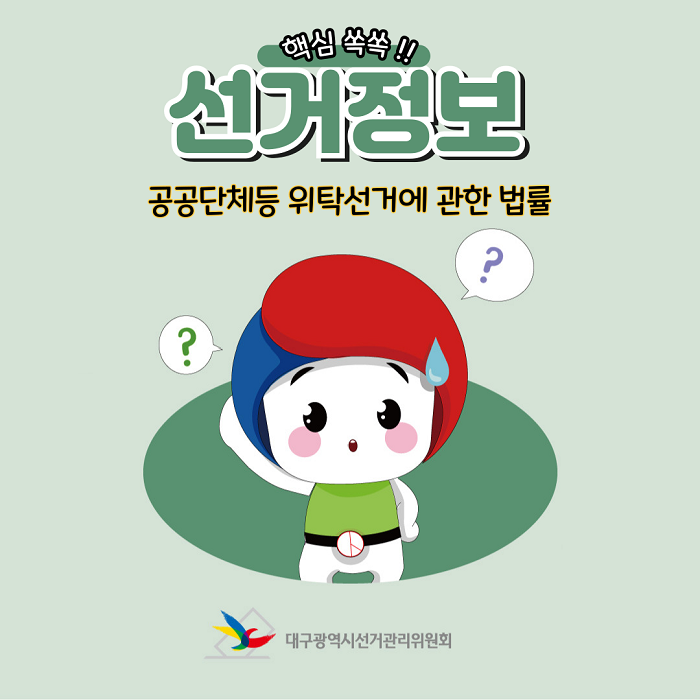 대구광역시선거관리위원회 홍보과(053-767-2584)에서 제작한 핵심쏙쏙!! 선거정보(공공단체등 위탁선거에 관한 법률) 저작물은 "공공누리" 출처표시-상업적 이용금지-변경금지 조건에 따라 이용할 수 있습니다. 자세한 내용은 [저작권정책]을 확인하십시오.