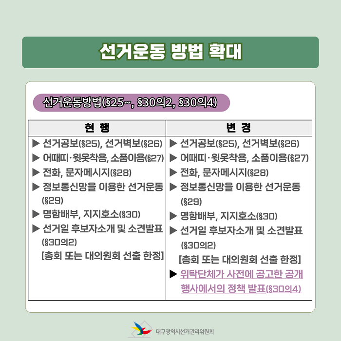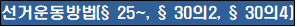 - 선거공보(§25), 선거벽보(§25) - 어때띠,윗옷착용, 소품이용(§27) - 전화, 문자메시지(§28) - 정보통신망을 이용한 선거운동(§29) - 명함배부, 지지호소(§30) - 선거일 후보자소개 및 소견발표(§30의2)(총회 또는 대의원회 선출 한정) |