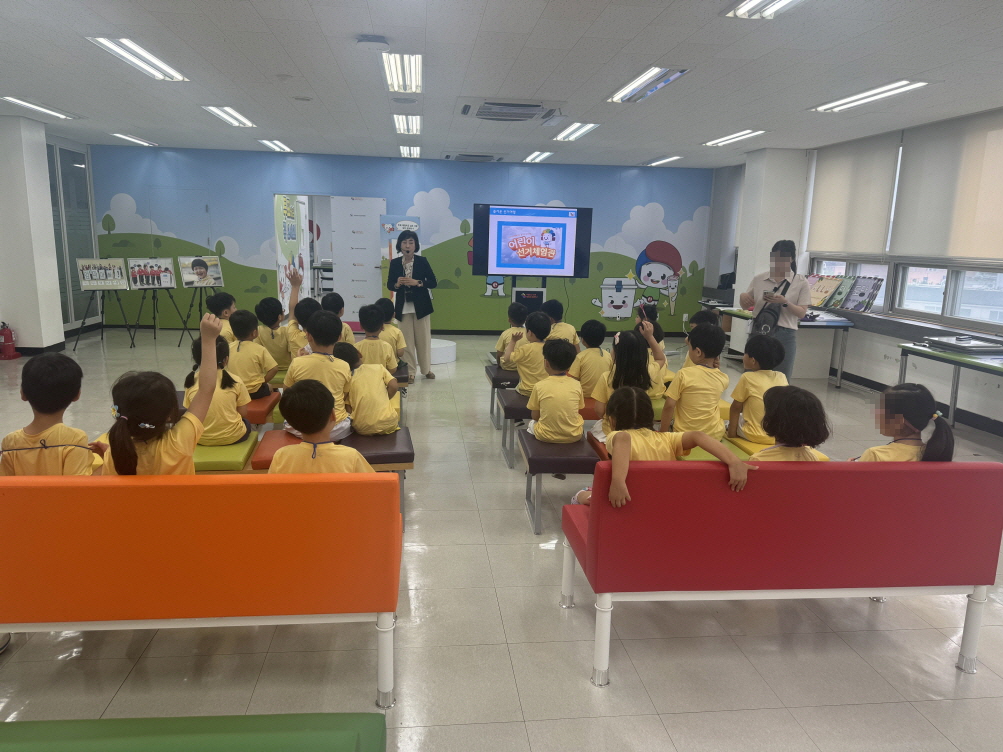 * 사진설명 : 29명의 원아들과 인솔 교사 1명이 서울특별시선거관리위원회 선거체험관 강의존에서 민주시민교육 강사의 강의를 경청하고 있다.