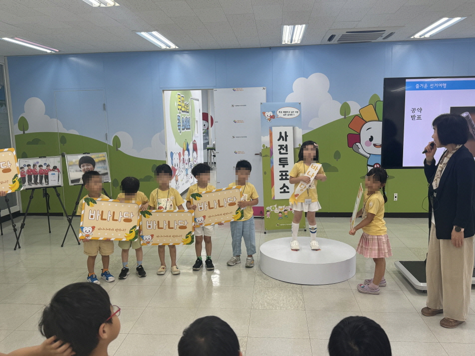 * 사진설명 :선거체험관 강의존에서 원아 1명이 단상 위에서 공약을 발표하고 원아 6명은 각자의 피켓을 들고 선거운동 체험을 하고 있다.