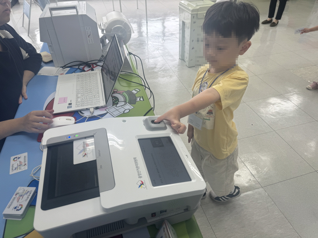 * 사진설명 : 선거체험관 체험존에서 한 원아가 본인확인기에 손도장을 찍고 있다.