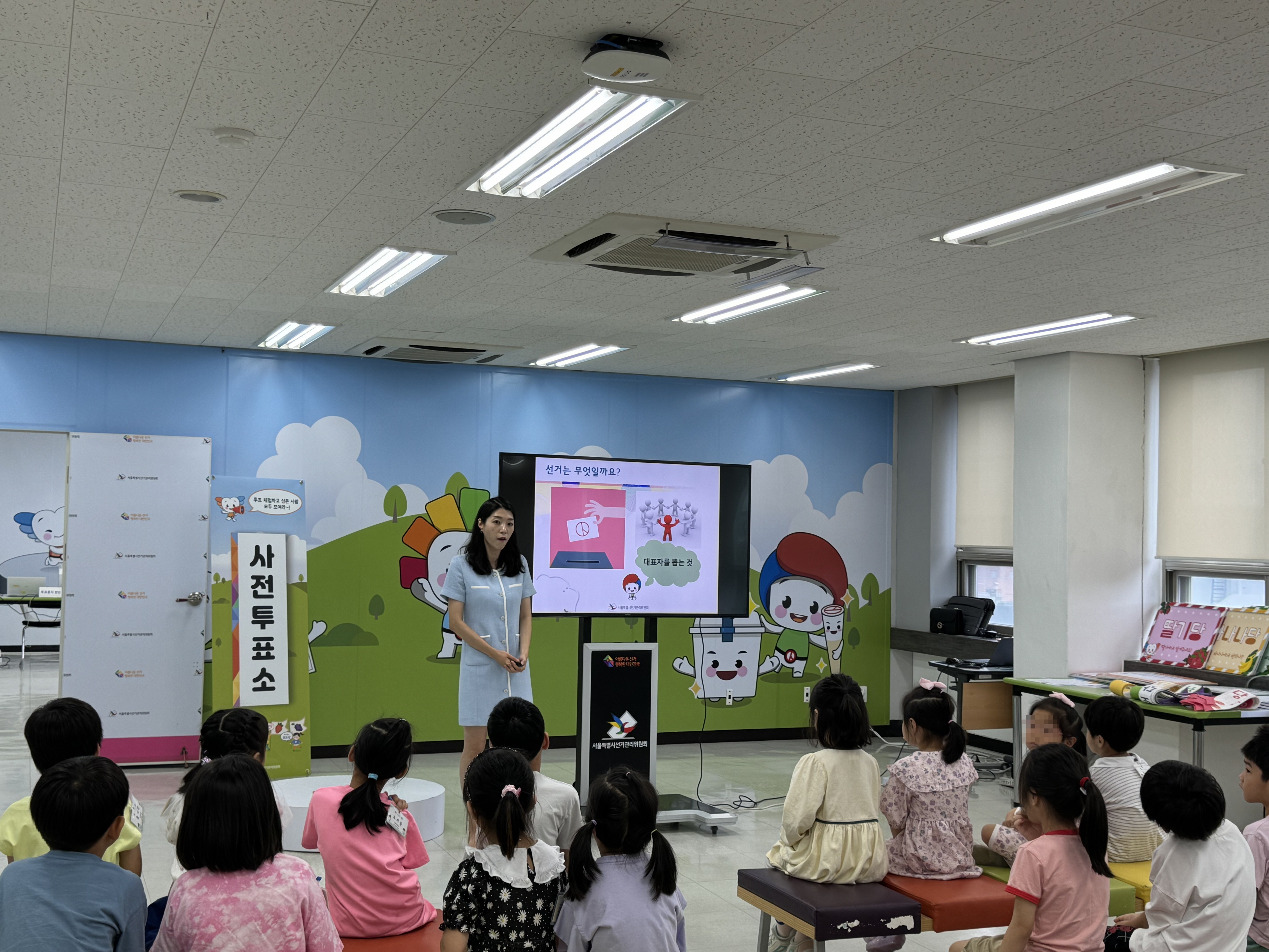 * 사진설명 : 17명의 원아들과 인솔 교사 1명이 서울특별시선거관리위원회 선거체험관 강의존에서 민주시민교육 강사의 강의를 경청하고 있다.