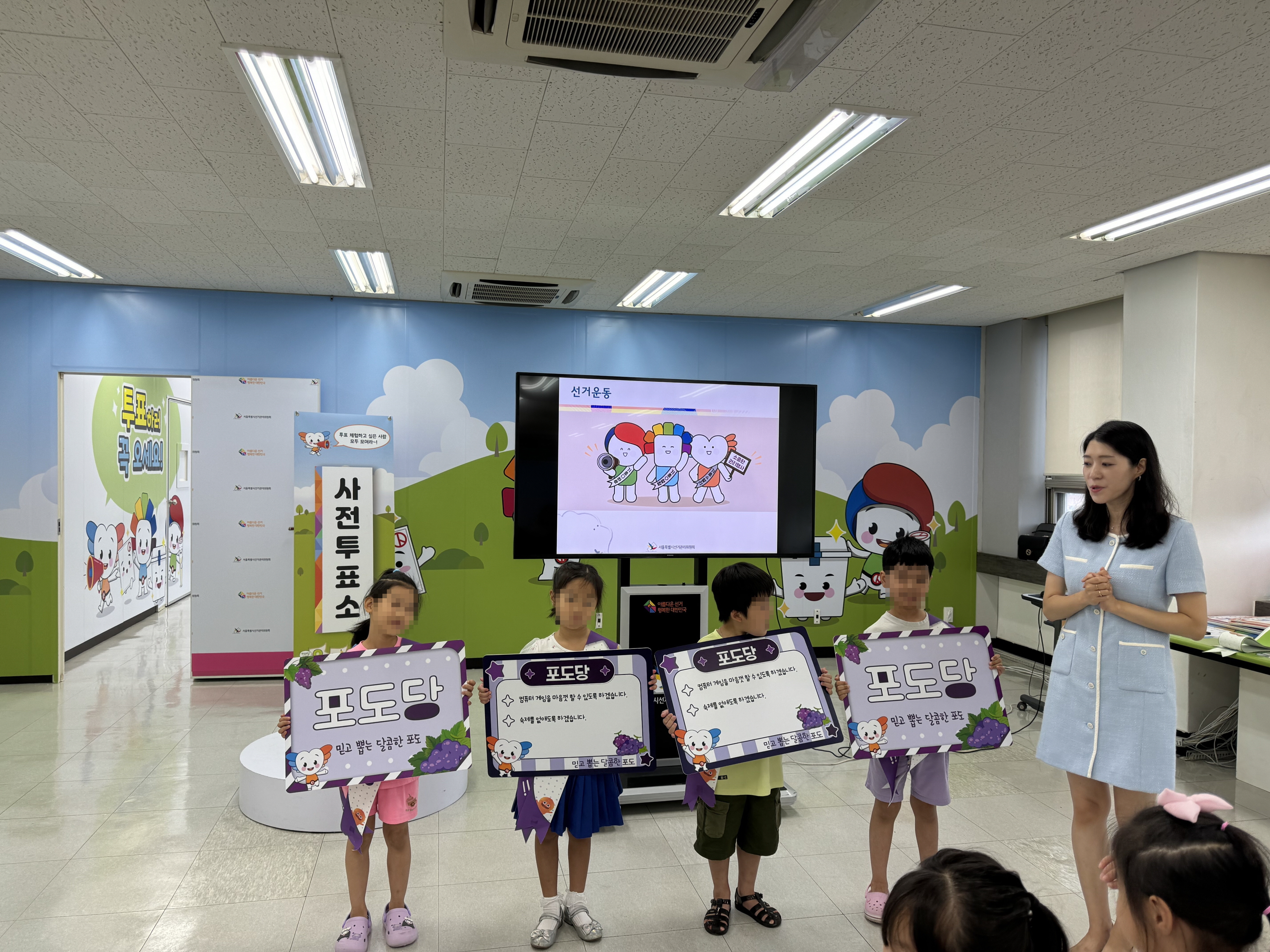 * 사진설명 :선거체험관 강의존에서 원아 4명이 공약을 발표하고 피켓을 들어 선거운동 체험을 하고 있다.
