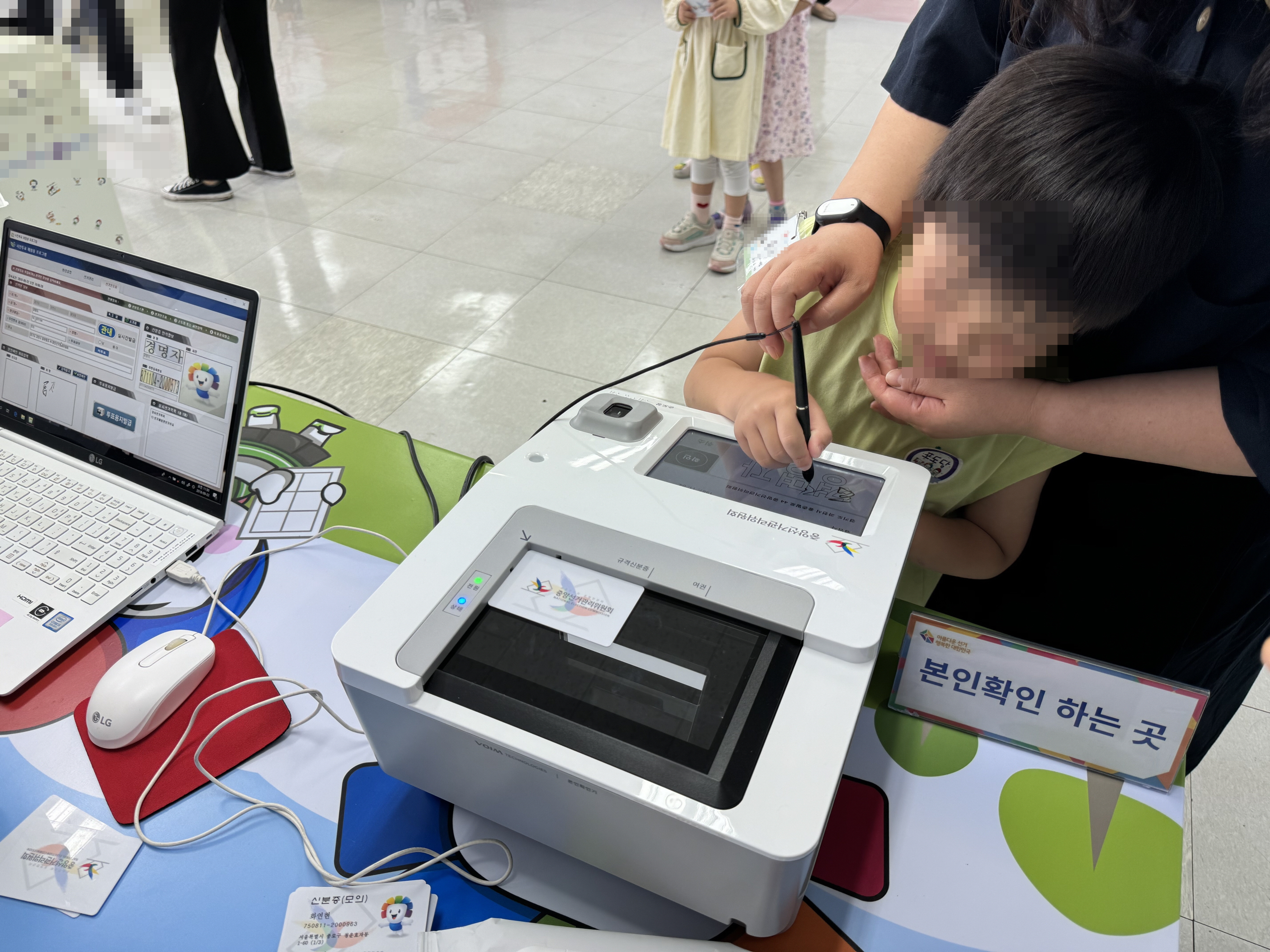 * 사진설명 : 선거체험관 체험존에서 한 원아가 본인확인기를 통해 본인확인을 하고 있다.