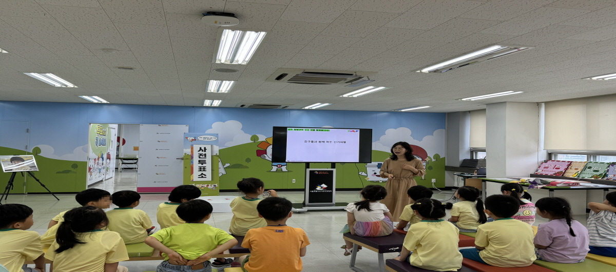 * 사진설명 : 어린이집 15명의 원아들이 서울특별시선거관리위원회 선거체험관 강의존에서 민주시민교육 강사의 강의를 경청하고 있다.