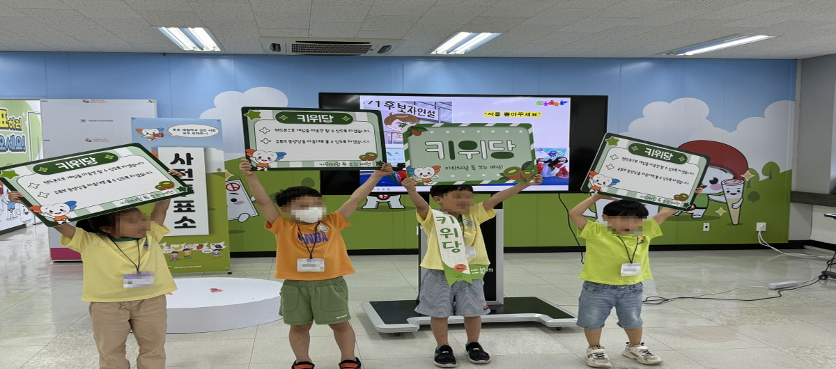 * 사진설명 : 원아 4명이 선거체험관 강의존에서 각자의 피켓을 들고 선거운동 체험을 하고 있다.