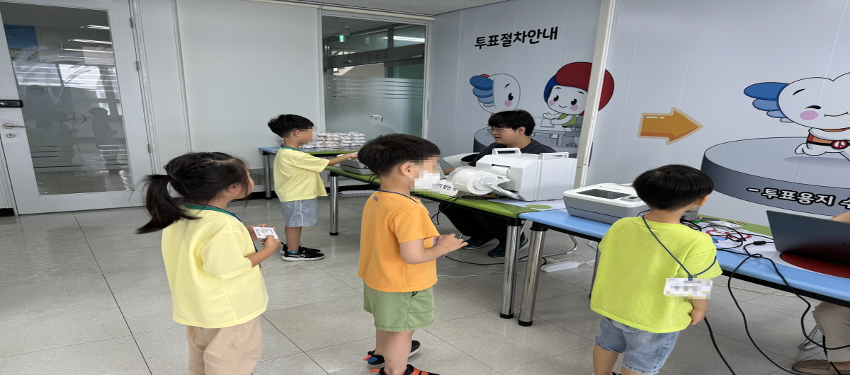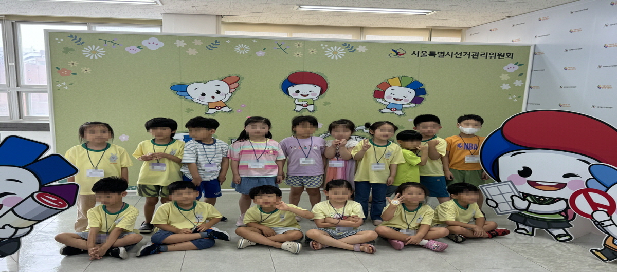 2024. 7. 19.(금) 10:30 강동구에 위치한 구립 래미안힐스테이트어린이집에서 16명의 원아들이 서울특별시선거관리위원회 선거체험관을 방문하여, 약 1시간 동안 맞춤형 민주시민교육과 함께 선거운동, 사전투표, 개표의 순서로 체험활동을 하였습니다.