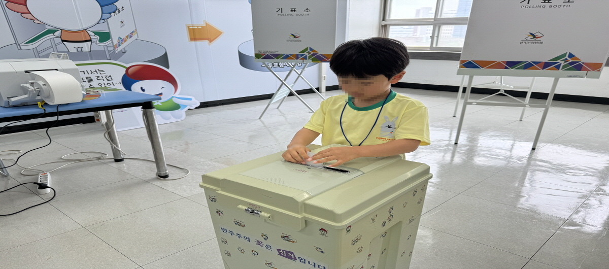 * 사진설명 : 체험존 기표소에서 기표를 마친 한 원아가 투표함에 투표지를 넣고 있다.