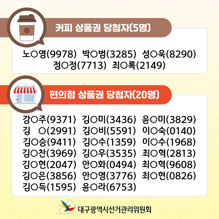 대구광역시선거관리위원회 홍보과(053-767-2584)에서 제작한 선소감이벤트 #6 당첨자 발표 저작물은 "공공누리" 출처표시-상업적 이용금지-변경금지 조건에 따라 이용할 수 있습니다. 자세한 내용은 [저작권정책]을 확인하십시오.