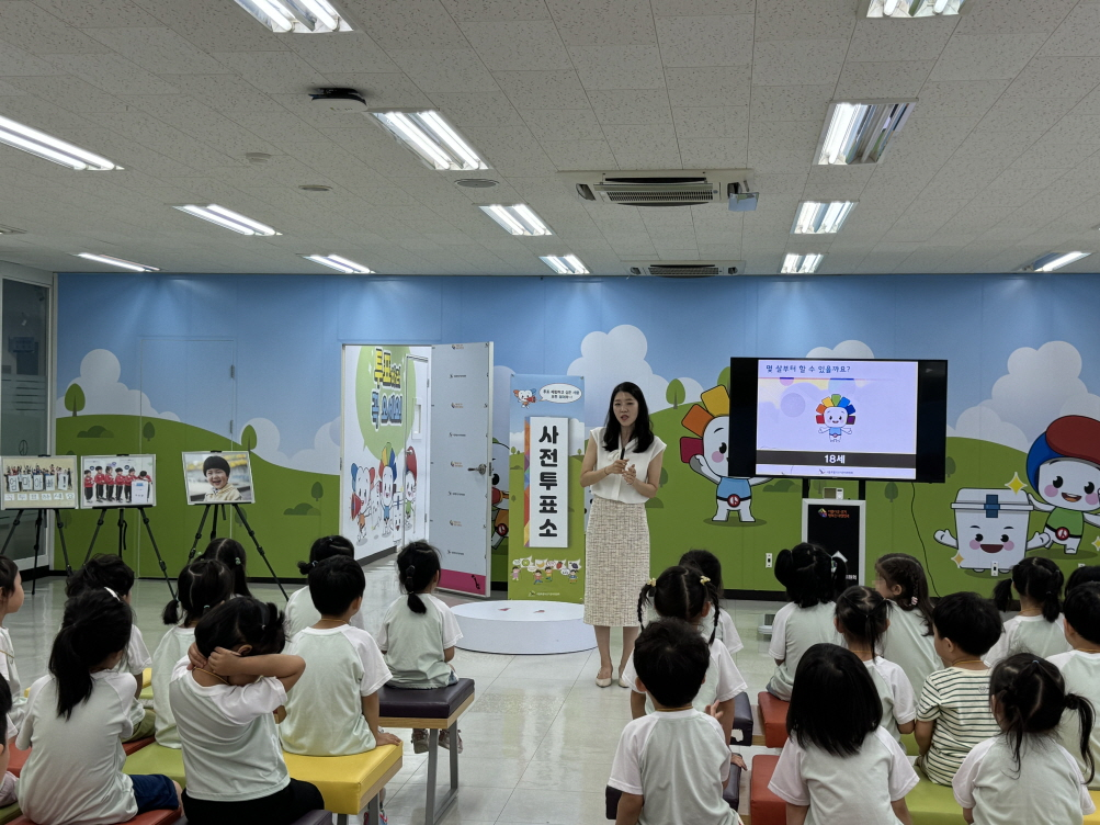 * 사진설명 : 종암어린이집 20명의 원아들이 서울특별시선거관리위원회 선거체험관 강의존에서 민주시민교육 강사의 강의를 경청하고 있다.