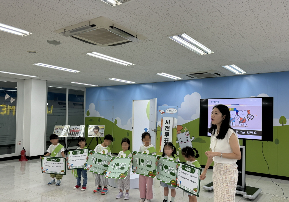 * 사진설명 : 원아 7명이 선거체험관 강의존에서 각자의 피켓을 들고 선거운동 체험을 하고 있다.