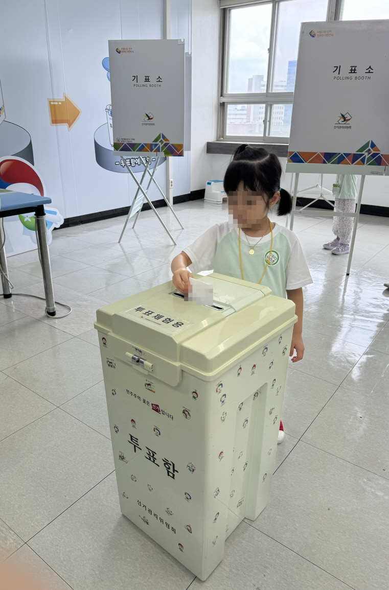 * 사진설명 : 체험존 기표소에서 기표를 마친 한 원아가 투표함에 투표지를 넣고 있다.