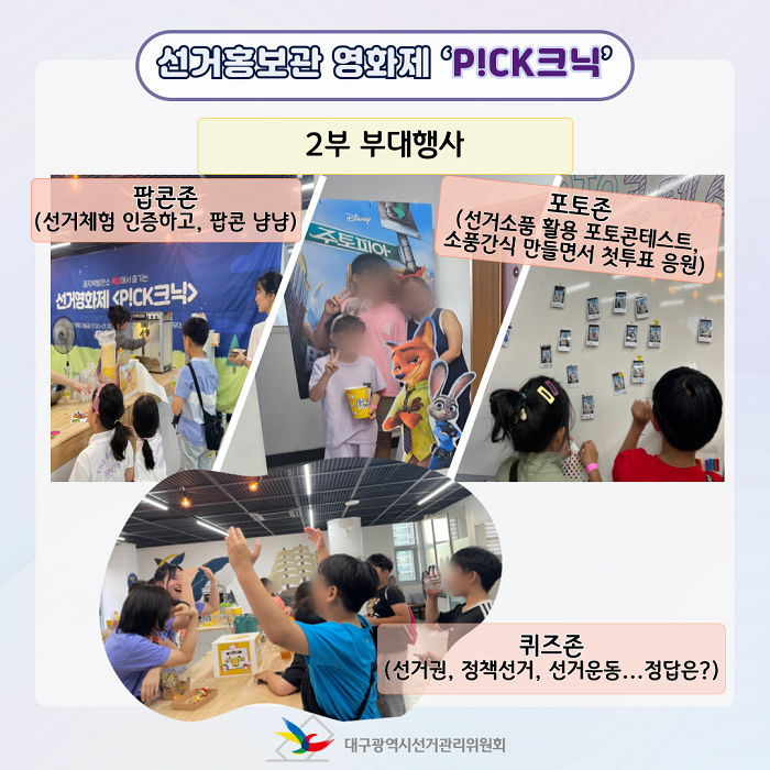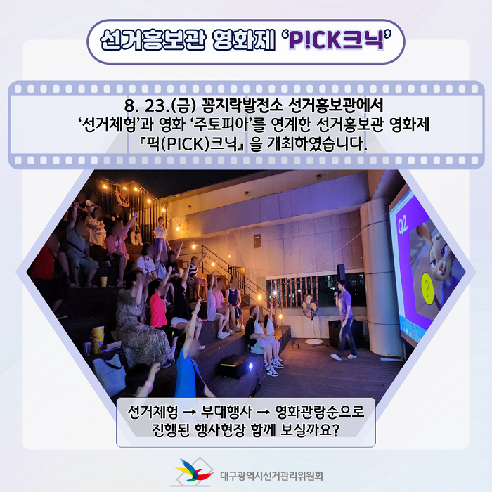 8. 23.(금) 꼼지락발전소 선거홍보관에서 ‘선거체험’과 영화 ‘주토피아’를 연계한 선거홍보관 영화제 『픽(PICK)크닉』 을 개최하였습니다.
