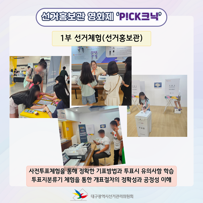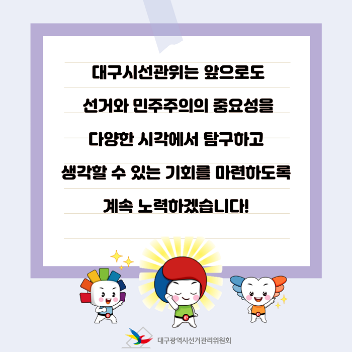 대구시선관위는 앞으로도 선거와 민주주의의 중요성을 다양한 시각에서 탐구하고 생각할 수 있는 기회를 마련하도록 계속 노력하겠습니다!