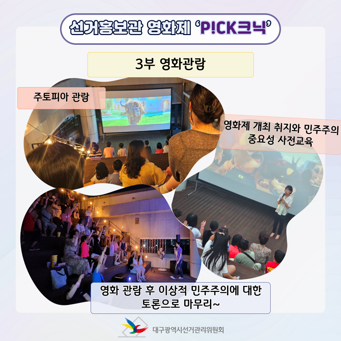 대구광역시선거관리위원회 홍보과(053-767-2584)에서 제작한 요즘 우리 선거관리위원회 #16(선거홍보관 영화제 'P!CK크닉') 저작물은 "공공누리" 출처표시-상업적 이용금지-변경금지 조건에 따라 이용할 수 있습니다. 자세한 내용은 [저작권정책]을 확인하십시오.