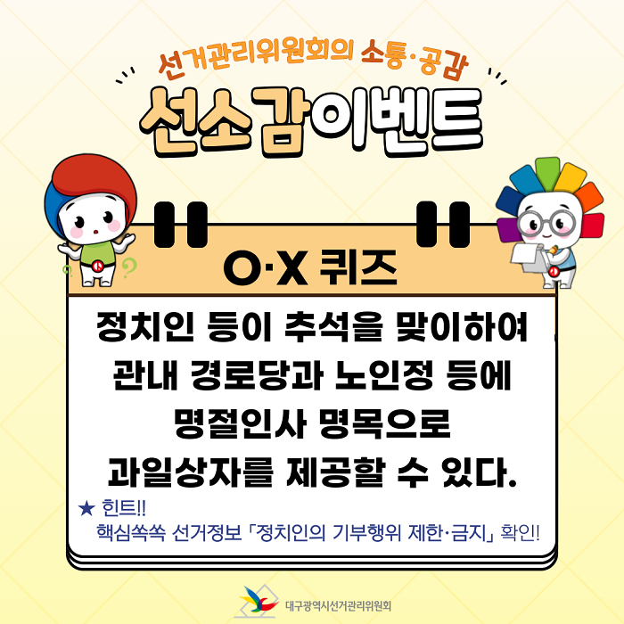 힌트) 2024. 8. 23.에 대구광역시선거관리위원회 홈페이지, 인스타그램과 네이버블로그에 게시된 <핵심쏙쏙!! 선거정보> [정치인의 기부행위 상시 제한?금지]게시물을 참고하시기 바랍니다.
