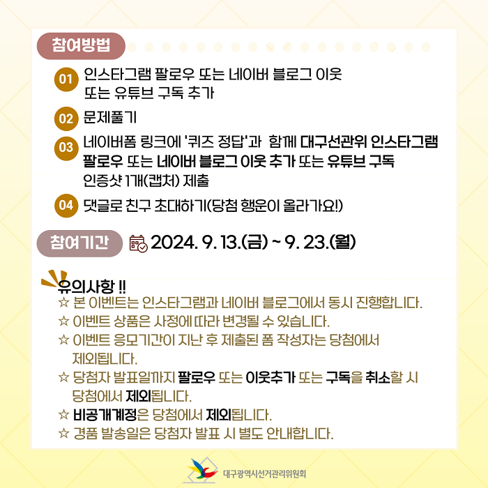 ①대구선관위 인스타그램 팔로우, 네이버 블로그 이웃추가 또는 유튜브 구독을 한다.