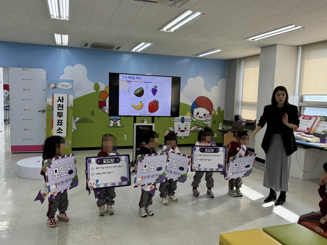 * 사진설명 : 원아 6명이 선거체험관 강의존에서 각자의 피켓을 들고 선거운동 체험을 하고 있다.