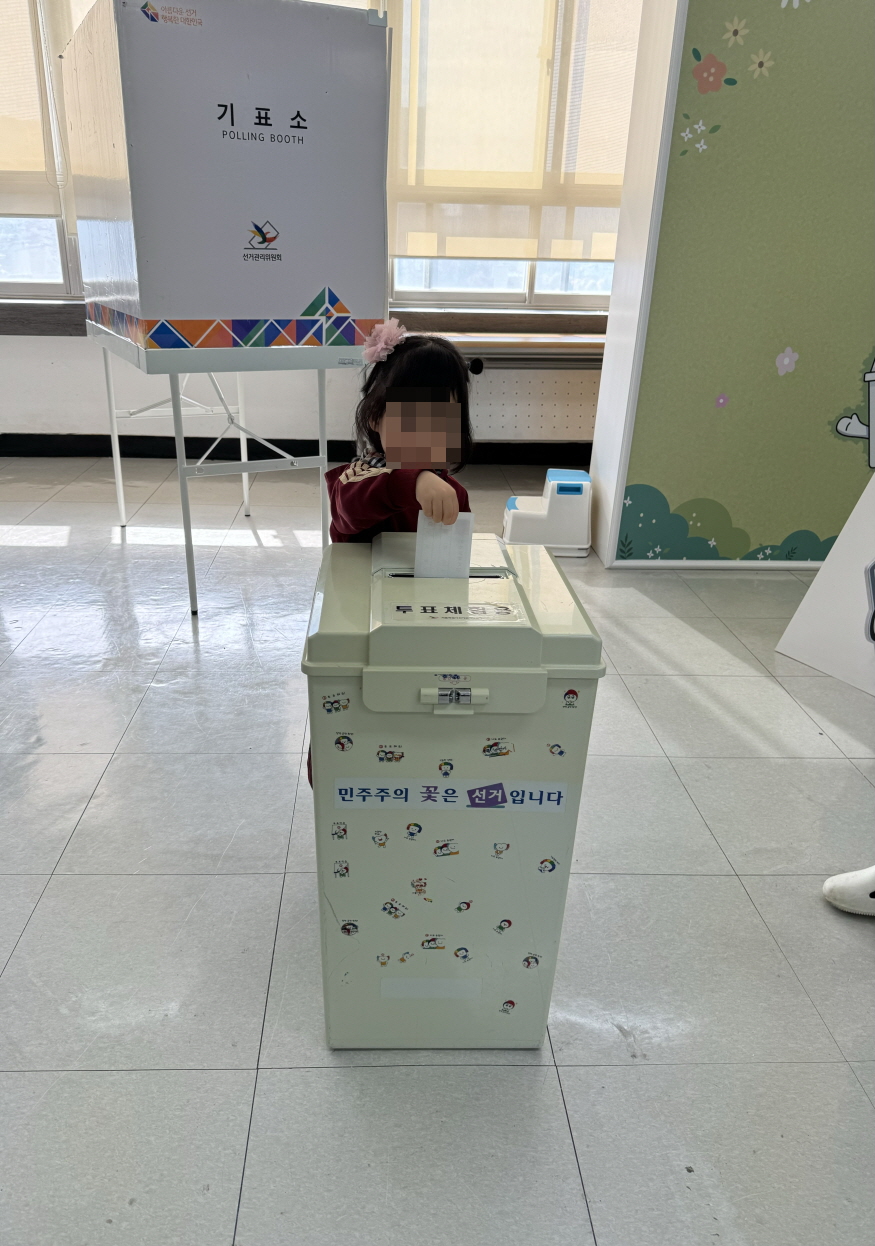 * 사진설명 : 체험존 기표소에서 기표를 마친 한 원아가 투표함에 투표지를 넣고 있다.