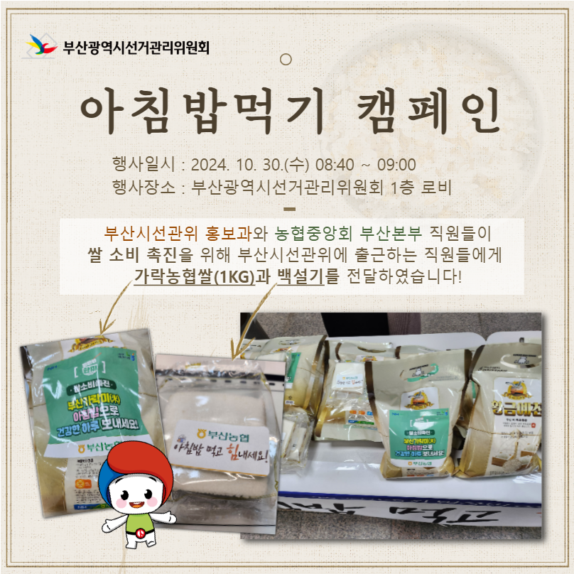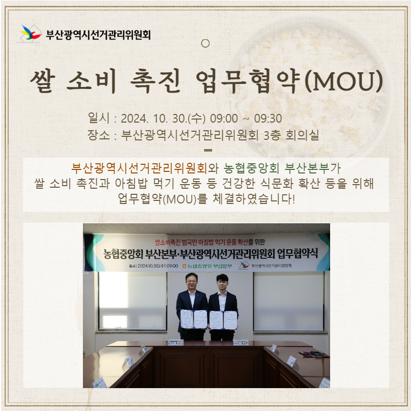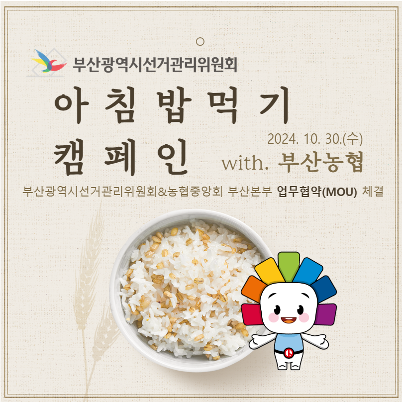 2024. 10. 30.(수) 부산시선관위와 농협중앙회 부산본부가 쌀 소비 촉진과 건강한 식문화 확산을 위해 아침밥 먹기 캠페인을 실시하고 업무협약(MOU)을 체결하였습니다!